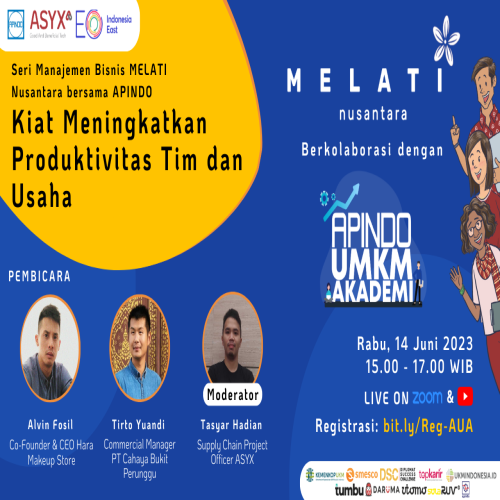 Asosiasi Pengusaha Indonesia (APINDO) mengundang Anda untuk mengikuti webinar Seri Manajemen Bisnis MELATI Nusantara bersama APINDO dengan tema "Kiat Meningkatkan Produktivitas Tim dan Usaha".